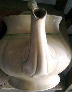 Kondisi teko seperti tampak pada gambar, tampak retak seribu yang menunjukkan usia tua dari benda ini. Terdapat beberapa cuil kecil pada pinggiran bibir teko dan pada ujung moncongnya.